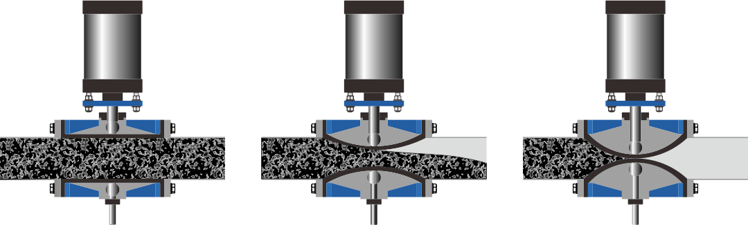 Fechar: O mecanismo de acionamento (manual, pneumático ou elétrico) empurra duas hastes de fixação, comprimindo com precisão a luva resiliente ao longo da linha central para obter uma vedação elermética. Mesmo quando partículas sólidas estão presentes no meio, elas ficam firmemente fechadas e bloqueadas.